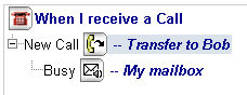 The procedure for inserting an action is best explained by example. In the following scenario, we build on the example in the Reusing an Action topic. Assuming the following call flow, we will insert an Override action between the When I receive a call and Transfer to Bob actions.